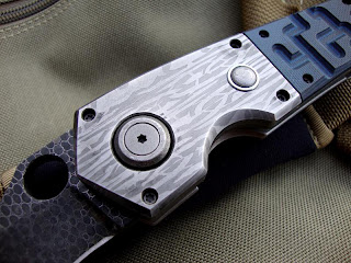 I just finished the one of a kind double action automatic folder for a customer. Turned out to be one of my best work ever in my ow opinion. I like the kind of futuristic look it has ...old mixed with newThe blade is 5 3/4" Bertie Reitveld Dragonskin damascus. The same material is used for the button and the screw collars. The bolster and clip is made from Ed Schempp Barbed Wire Damascus. The frame is titanium that has been beadblasted, anodized and stonewashed. The scale is black/blue G10 with techno texture.A small video also: http://www.youtube.com/watch?v=oVfUgAHbhHA